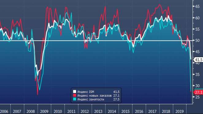 Падение индекса деловой активности ISM в обрабатывающей промышленности США в апреле оказалось не столь драматичным, как опасались экономисты: с 49.1 пункта в марте он упал до 41.5, что стало минимальным значением за последние 11 лет, но оказалось выше прогноза в 36.0 пункта.