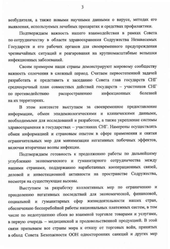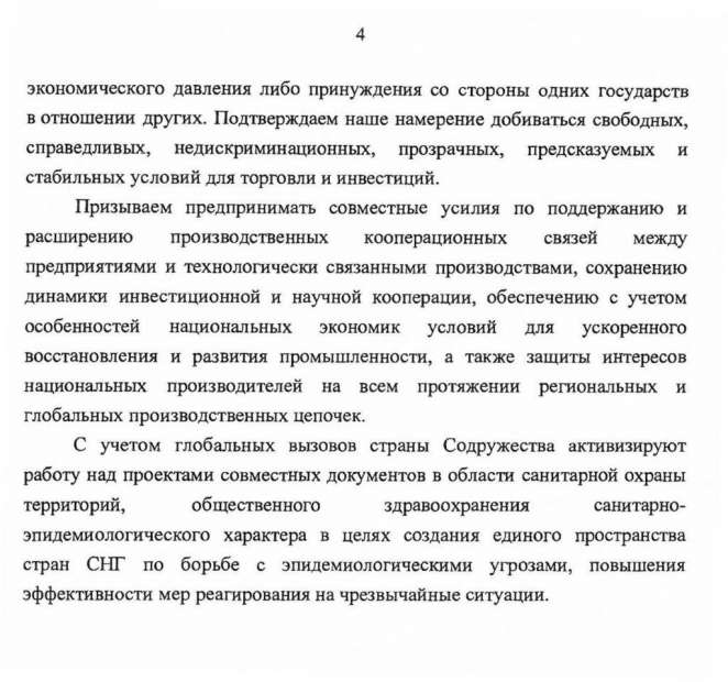 Кроме правильных в целом слов об опасности, которая возникла в результате пандемии COVID-19, особое внимание заслуживает концовка документа, ради которой он, вероятно, и писался: «призываем все страны мира к отказу от торговых войн, принятых в обход Совета Безопасности ООН односторонних санкций и других мер экономического давления или принуждения со стороны одних государств в отношении других. Подтверждаем наше намерение добиваться свободных, справедливых, недискриминационных, прозрачных, предсказуемых и стабильных условий для торговли и инвестиций». Фактически это и есть призыв к отмене санкций.