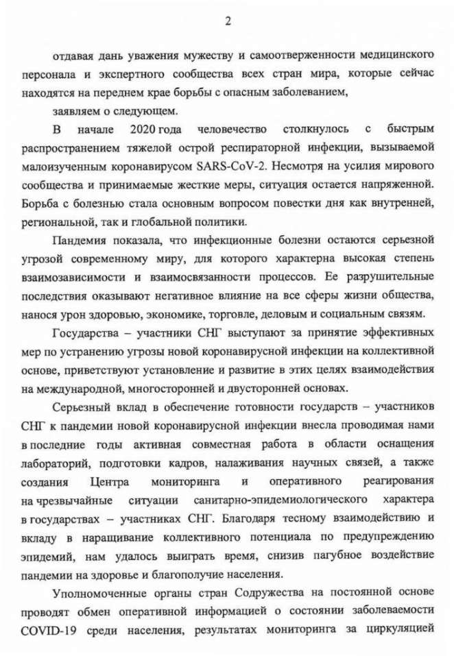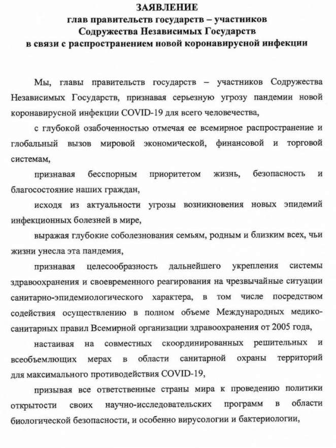 По информации полученной из дипломатических источников, Москва предложила главам стран СНГ выступить с совместным заявлением в связи с распространением новой коронавирусной инфекции.