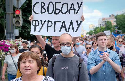 «Верните нам Фургала» кричат люди, вышедшие на центральные улицы Хабаровска. Они скандируют «Фургала домой!», «Честный суд в Хабаровске», «Москва, услышь нас», «Фургал, мы с тобой» и «Свободу». Толпа, как и в остальные дни протеста, идет прямо по проезжей части в центре города, сопровождаемая гулом автомобилей и мопедов, поддерживающих демонстрантов. Впереди колонны велосипедисты с флагом Хабаровского края — прямую трансляцию в Twitter ведет Штаб политика Алексея Навального в Хабаровске. Сотни человек, многие с плакатами и футболками с надписью «я/мы Сергей Фургал» двинулись к правительству Хабаровского края, где у входа в здание уже выстроилась цепь из полицейских, как это происходило и на предыдущих акциях. Участники акции благодарят их за то, что они не вмешиваются. Силовикам кричат: «Полиции спасибо!», «Полиция с народом». Правоохранители начали раздавать демонстрантам медицинские маски.