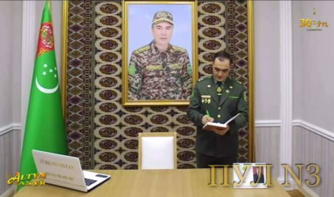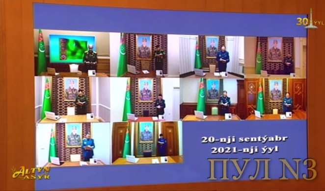 Буквально на днях туркменский правитель с помпой открыл новую гострибуну для себя. Теперь госСМИ показали онлайн-совещание с участием военных, которые зачитывают доклады на фоне больших портретов Гурбангулы.