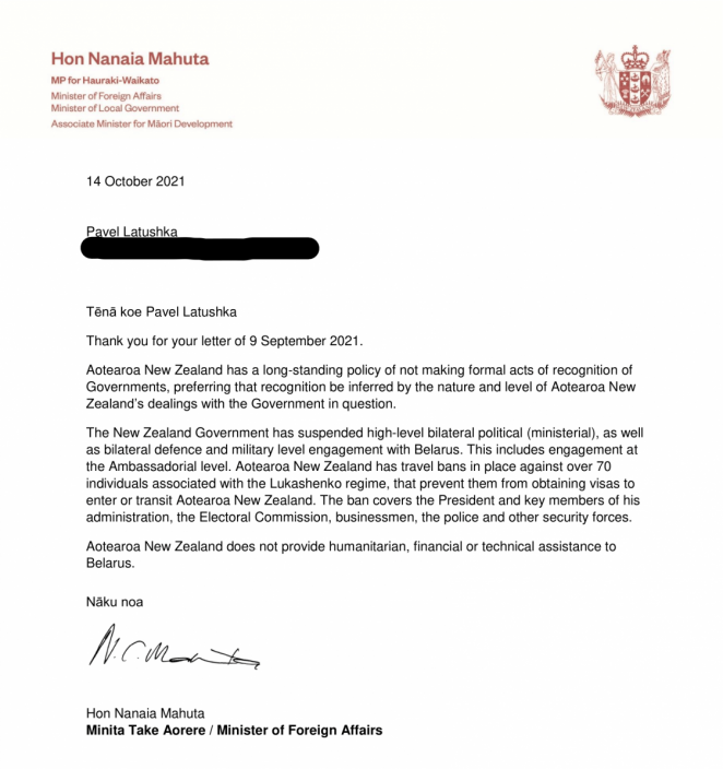 В нём сообщается, что Новая Зеландия издавна не принимает официальных актов признания правительств. О признании/непризнании той или иной власти легитимной можно судить по характеру и уровню отношений с правительством иностранного государства. Поэтому, сообщила Нанаи Махуто, Новая Зеландия приостановила двусторонние политические отношения на высоком уровне с Беларусью. В том числе на уровне послов и министерств двух стран.