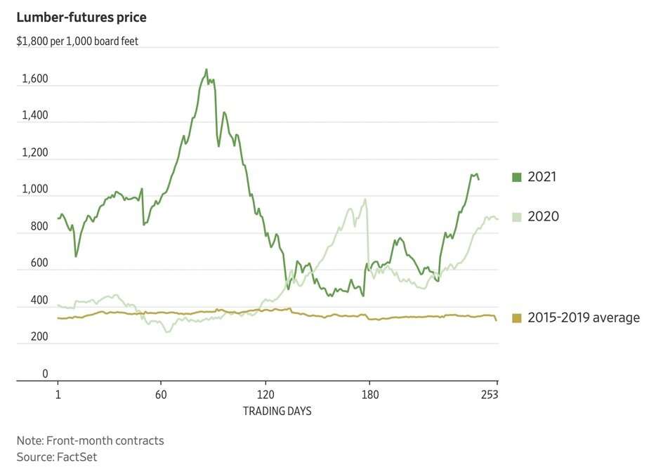 Цены на древесину почти вдвое превышают уровень 2020 года, пишет The Wall Street Journal. Причем, уже во второй половине 2020 года цены резко выросли.