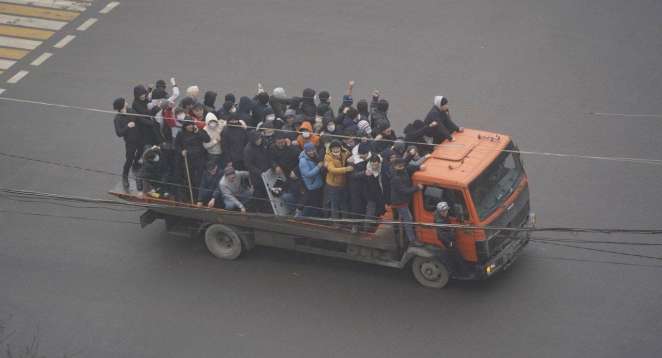 В Алматы участники протестов захватывают технику, в сети появляются фото и видеофакты, как протестующие верхом на спецтехнике двигаются в центр города.