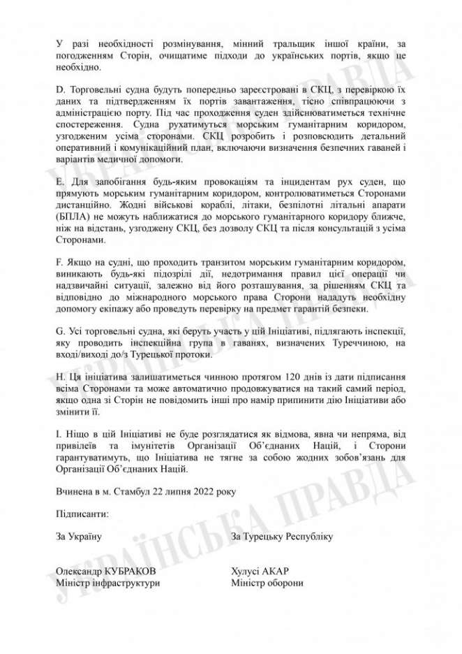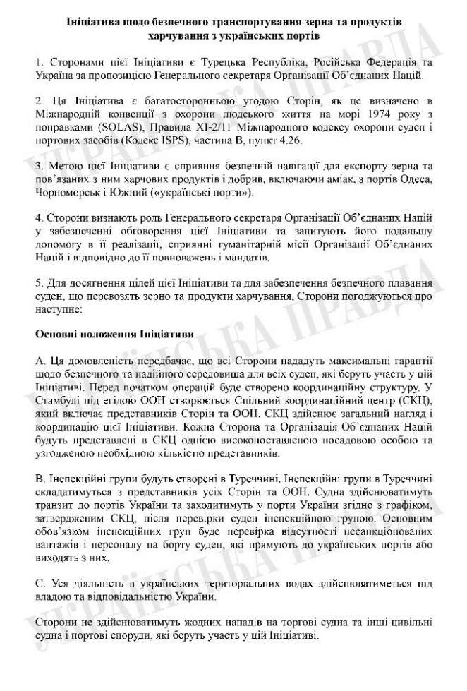 Подписанный документ называется «Инициатива по безопасной транспортировке зерна и продуктов питания из украинских портов». При этом Украина не подписывала никаких документов непосредственно с Россией. Инициатива, подписанная представителями Турции, ООН и Украины, должна быть утверждена Кабинетом министров и опубликована в полном объеме. Такой же документ отдельно подписали представители Турции, ООН и России. С украинской стороны документ подписал министр инфраструктуры Александр Кубраков. Подписант с российской стороны — министр обороны Сергей Шойгу.