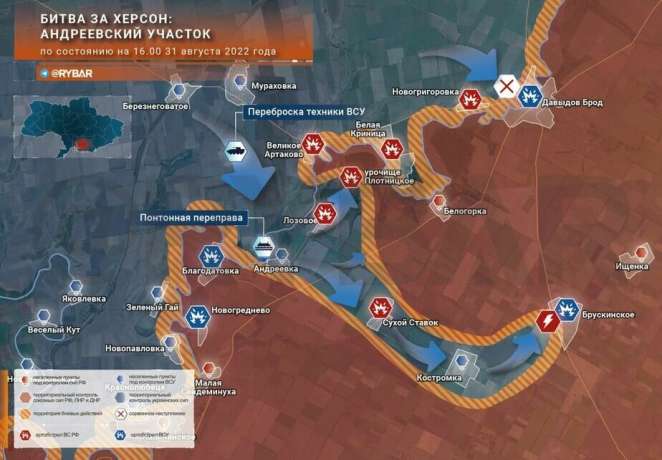 По информации «Рыбаря», возле Андреевки и Лозового украинская армия не только, вопреки утверждениям российской пропаганды, удержала Сухой Ставок, но вышла к деревне Брускинское, через которую идет главная дорога к Давыдовому Броду. Украинцы удержали все захваченные переправы через реку Ингулец.
