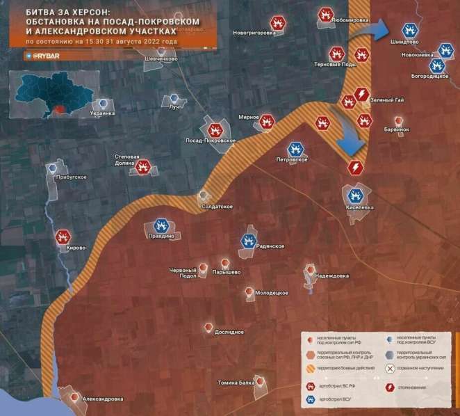 Российский шовинистический телеграм-канал «Рыбарь», который имеет многочисленные источники в армии и позволяет себе писать больше, чем официальные СМИ, подтвердил, что украинские войска продолжали развивать успех, достигнутый в понедельник и вторник 29 и 30 августа.