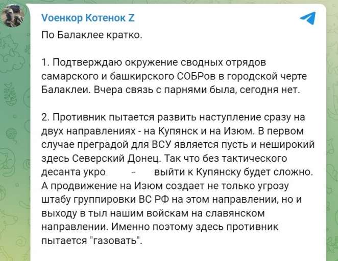 «Подтверждаю окружение сводных отрядов самарского и башкирского СОБРов в городской черте Балаклеи. Вчера связь с парнями была, сегодня нет», — написал Котенок в среду, 7 сентября, у себя в Telegram-канале.
