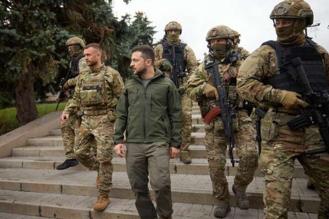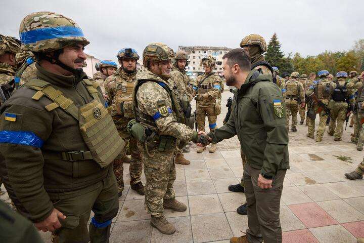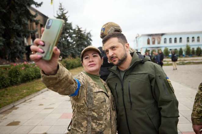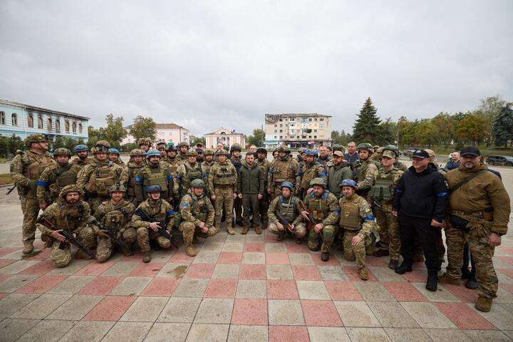 Президент Украины Владимир Зеленский в освобожденном несколько дней назад Изюме принял участие в церемонии поднятия государственного флага Украины. Об этом сначала сообщила 25-я отдельная воздушно-десантная Сичеславская бригада в Facebook, а позже фото появились в официальном телеграм-канале украинского президента.