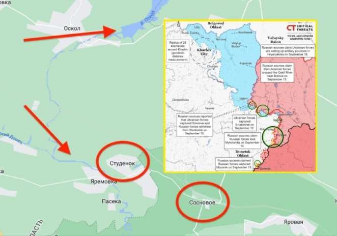 Согласно информации российских источников, ВСУ в Донецкой области удалось вытеснить войска РФ с поселка Сосновое на северном берегу реки Северский Донец и на данным момент они там укрепляют свои позиции. Кроме того, источник сообщил, что российские войска отошли из Студенки непосредственно к западу от Сосново, чтобы избежать окружения.