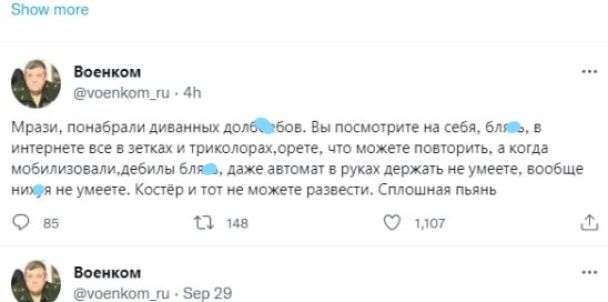 «Мрази, набрали диванных дол…ов. Вы посмотрите на себя в интернете все в зетках и триколорах, кричите, что можете повторить, а когда мобилизовали, даже автомат в руках держать не умеете, вообще ничего не умеете. Костер и то не можете развести. Сплошная пьянь», — истерит «Военком».