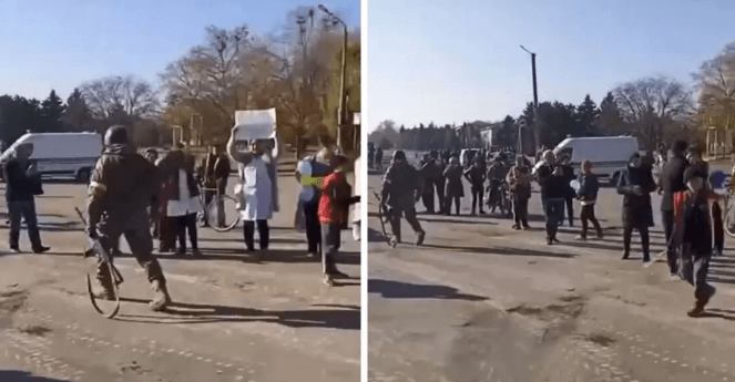 Видео длится всего 7 секунд. Но за это время камера успевает продемонстрировать атмосферу, царящую на центральной площади деоккупированного населенного пункта.