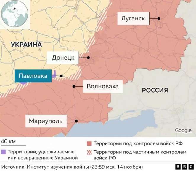 Павловка расположена к юго-западу от Донецка. Это довольно большое по площади, но, по украинским меркам, далеко не самое крупное по численности (примерно 2,5 тысячи жителей до войны) село, почти примыкающее к городу Угледару, которое теоретически может стать плацдармом для наступления российских войск на Донбассе.