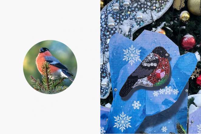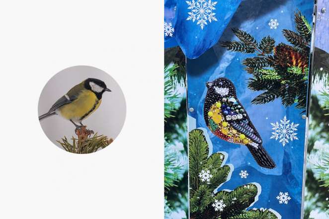 Если присмотреться к ограждению елки, то на нем можно увидеть снегирей и синичек. И все бы ничего, если бы не необычный цвет грудок у птичек.