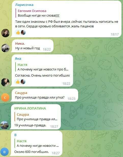 Российский шовинистический военкор Бессонов позже добавил у себя в канале: «По поводу удара по Макеевскому ПТУ. Местные сообщают, что удар был нанесен ровно в 00:01 по нашему времени. По моим сведениям противник в очередной раз применил американскую РСЗО «Хаймарс». Судя по всему, высокое командование до сих пор не в курсе о возможностях этого оружия. Надеюсь, что виновные, принимавшие решение по использованию этого объекта, будут наказаны».