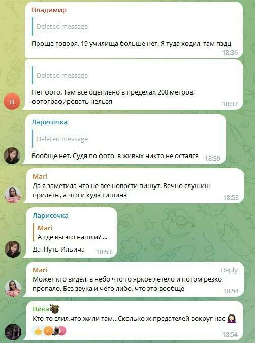 В то же время в местных чатах пишут, что украинская артиллерия нанесла удар по училищу в Макеевке под Донецком, где располагались российские солдаты. Мы собрали несколько скриншотов.