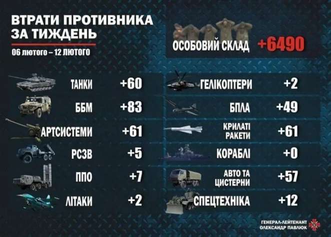 По данным ВСУ, за последнюю неделю (6 – 12 февраля) российские оккупационные войска потеряли почти 6,5 тысячи своих солдат в боях на территории Украины, а также 400 единиц вражеского вооружения и техники. В частности, армия РФ «обеднела» на два самолета, два вертолета и 60 танков.