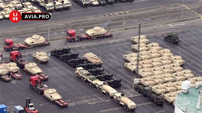 При разгрузке парома в немецком порту Бремергафен, кроме Bradley, были замечены еще и 90 Strykers.