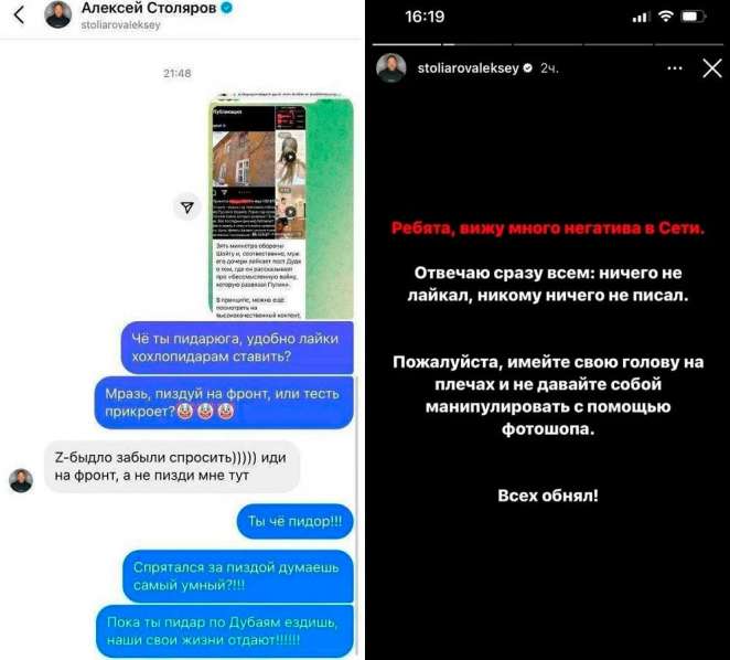 Блогер опубликовал новый пост, написав, что ничего не «лайкал» и ничего никому не писал. Столяров также попросил аудиторию «иметь свою голову на плечах», намекнув, что это фейк, а сам он стал жертвой манипуляций и фотошопа.