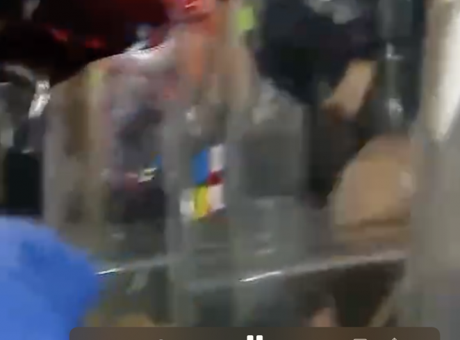 Наклейки с украинским и грузинским флагом клеят протестующие в Тбилиси на полицейские щиты. Скриншот из видео