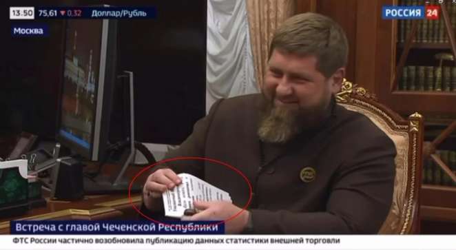 В начале встречи Рамзан Кадыров вынул из черной папки несколько листков бумаги и дрожащими руками начал говорить с Владимиром Путиным об «успехах» республики. Как оказалось впоследствии, это были шпаргалки опального чеченца.