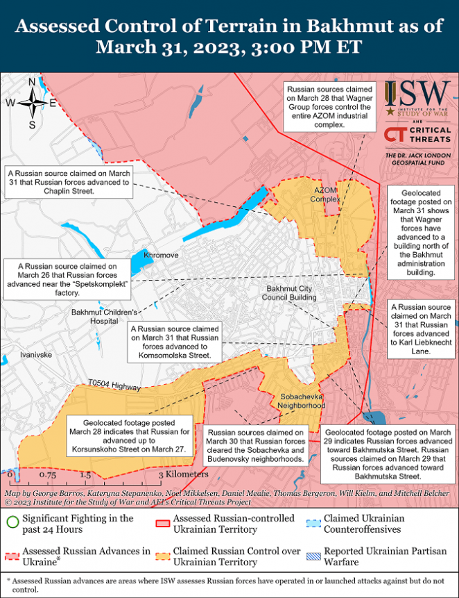 В то же время, по данным военных экспертов, 31 марта оккупанты продолжили попытки наступления в городе и окрестностях. Кадры с геолокацией показывают флаг группы ЧВК «Вагнера» в здании в центре Бахмута в пределах нескольких кварталов от здания городской администрации. Российские «военкоры» утверждали, что «Вагнер» наступает на севере и юге города.
