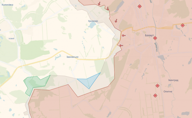Как свидетельствуют данные карты, противник потерял позицию южнее Ивановского, что расположено западнее Бахмута и южнее Хромово.