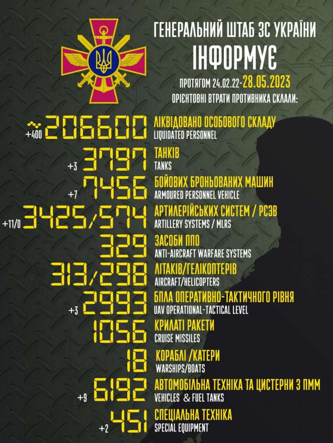 Общие боевые потери противника с 24.02.22 по 28.05.23 ориентировочно составили: