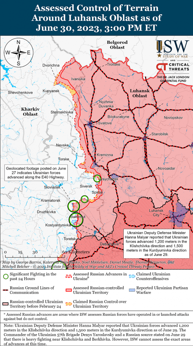 Украинские силы продолжали контрнаступление и, как сообщается, добились успехов в районе Бахмута 30 июня. Украинский Генштаб сообщил, что украинские силы достигли частичного успеха на линии Приволье-Зализнянское и закрепили новые позиции.