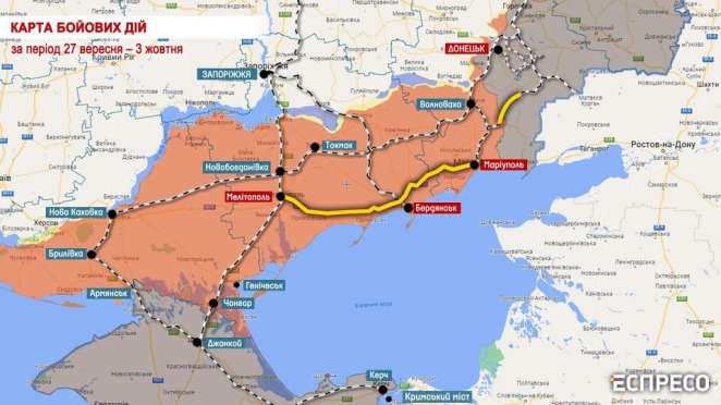Между тем, россияне принимают меры, чтобы в случае обрезания поставок через Крымский мост иметь возможность обеспечивать гарнизоны в Мариуполе, Бердянске и Мелитополе . В частности, они начали строительство дороги и железной дороги из Донецка в Мариуполь в обход простреливаемой ВСУ Волновахи . Кроме того, аналогичные логистические артерии они ведут из Таганрога через Мариуполь и Бердянск, вплоть до Мелитополя.