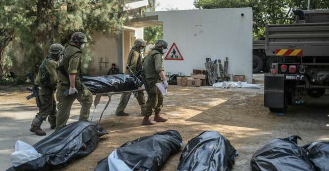 Военные выносят тела израильских жителей из разрушенного дома, 10 октября 2023 года, Кфар-Аза. Фото: Ilia Yefimovich / picture alliance via Getty Images