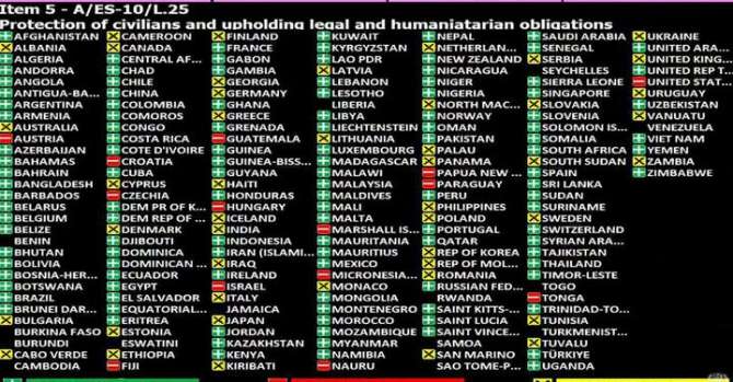 Канада предлагала добавить к иорданской резолюции следующий абзац: Генассамблея «безоговорочно отвергает и осуждает террористические акты ХАМАС, совершенные в Израиле с 7 октября 2023 года, и захват заложников, требует обеспечения безопасности и благополучия заложников и гуманного обращения с ними в соответствии с нормами международного права и призывает к их немедленному освобождению без каких-либо условий». Но поправку поддержали 88 стран, против выступили 53 делегации и 22 воздержались. Таким образом, поправка не набрала две трети голосов присутствующих в зале делегаций и не прошла.