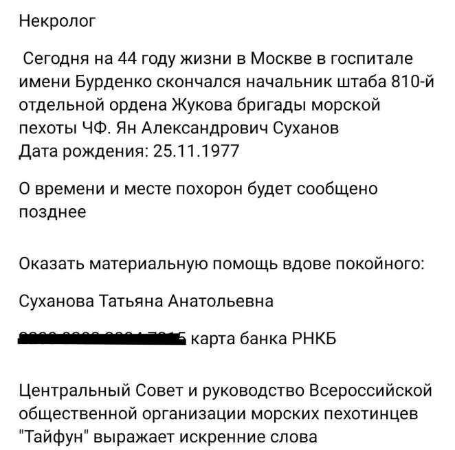 О смерти захватчика написал в среду, 8 ноября, офицер ВСУ Анатолий Штефан «Штирлиц» на своем канале в Telegram. Украинский военный опубликовал скриншот некролога, где указано, что Ян Суханов «задвухсотился» в российской столице в госпитале им. Бурденко.