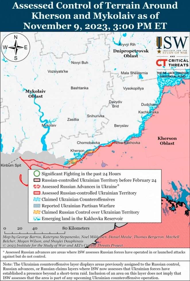 Отмечается также, что Силы обороны по состоянию на 9 ноября установили непрерывный контроль над позициями от Антоновского железнодорожного моста к северу от Поймы до Антоновского моста к северу от Олешек (7 км к югу от Херсона и 4 км от р. Днепр).