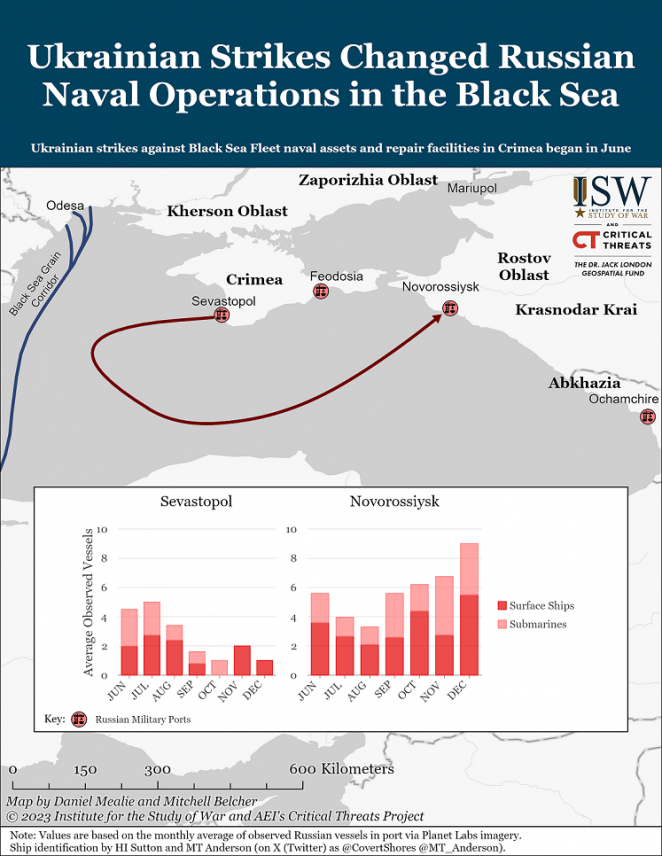 «Дальние удары Украины по средствам ЧФ способствовали гуманитарным и военным успехам в Черном море и позволили Украине перехватить инициативу в Черном море даже без эффективного собственного флота», — отметили в ISW.