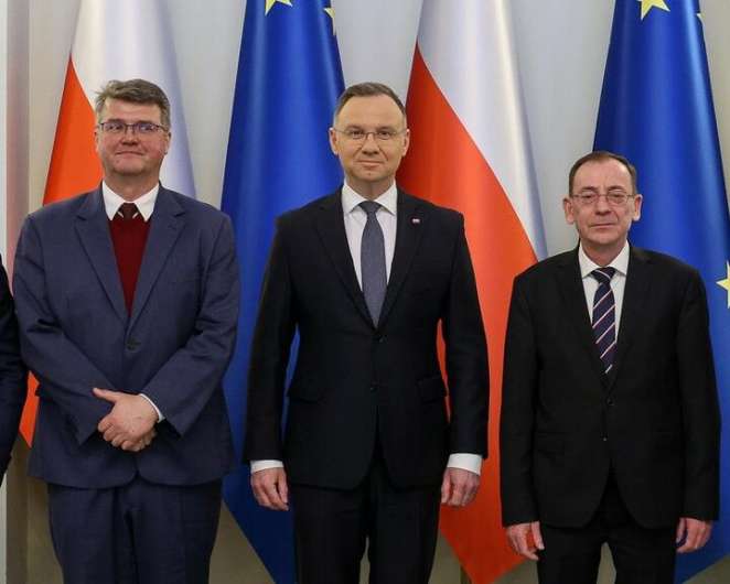 Экс-министр МВД Польши Мариуш Каминский (справа от президента Анджея Дуды) и его бывший заместитель Мацей Вонсик (слева от Дуды) на церемонии назначения новых советников. 9 января 2024 года, Варшава. Фото: Канцелярия Дуды