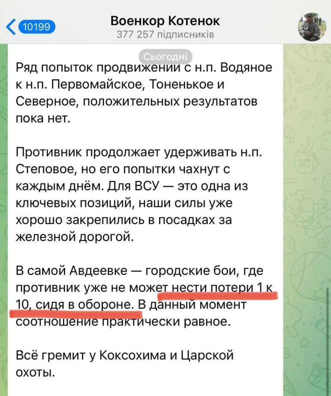 «В самой Авдеевке – городские бои, где противник уже не может нести потери 1 к 10, сидя в обороне», – невзначай сболтнул лишнего «военкор».