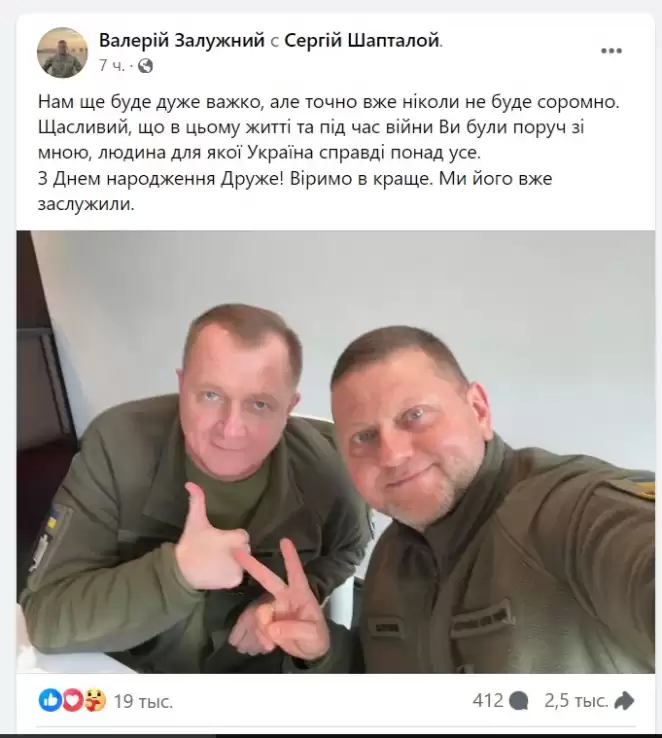 В своем сообщении, опубликованном на странице в Facebook, Валерий Залужный отметил, он счастлив тем, что в его команде есть такой человек, как Сергей Шаптала.