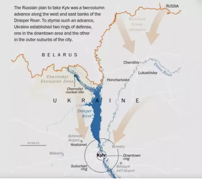 Для обороны Киева Александр Сырский организовал два кольца обороны — в пригороде столицы и на окраинах самого города. По замыслу генерал-полковника, внутренняя линия обороны должна была находиться как можно дальше от внешней, чтобы российская армия не обстреливала центр столицы из артиллерии.