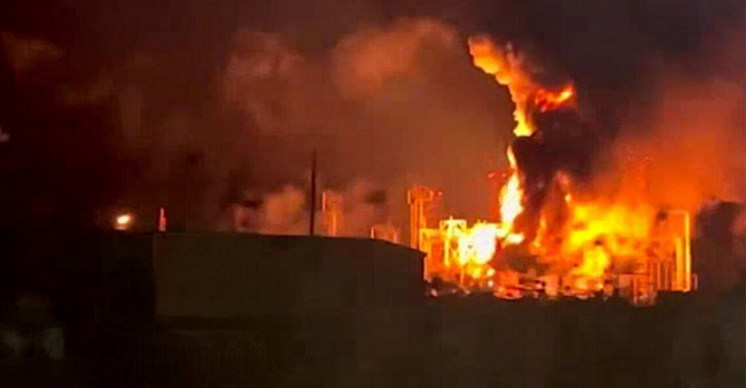 Очевидцы говорят, что у базы собралась большое количество пожарных машин. По их словам, горит резервуар объемом 100 тонн.