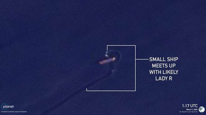 Снимки Planet Labs показывают, что небольшой корабль присоединился к вероятной Lady R утром 7 марта, когда он все еще стоял на якоре недалеко от Владивостока, возможно, для доставки топлива или припасов перед поездкой в Северную Корею.