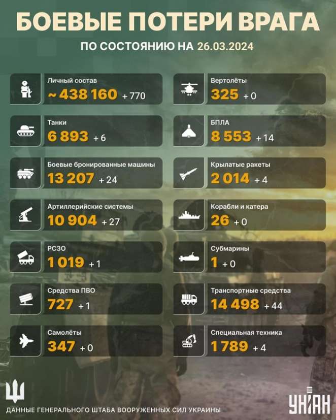 За прошедшие сутки ликвидировали 770 оккупантов, и после этого общие вражеские потери составляют 438 160 захватчиков, говорится в сообщении Генерального штаба Вооруженных сил Украины, размещенном на его странице в Facebook.