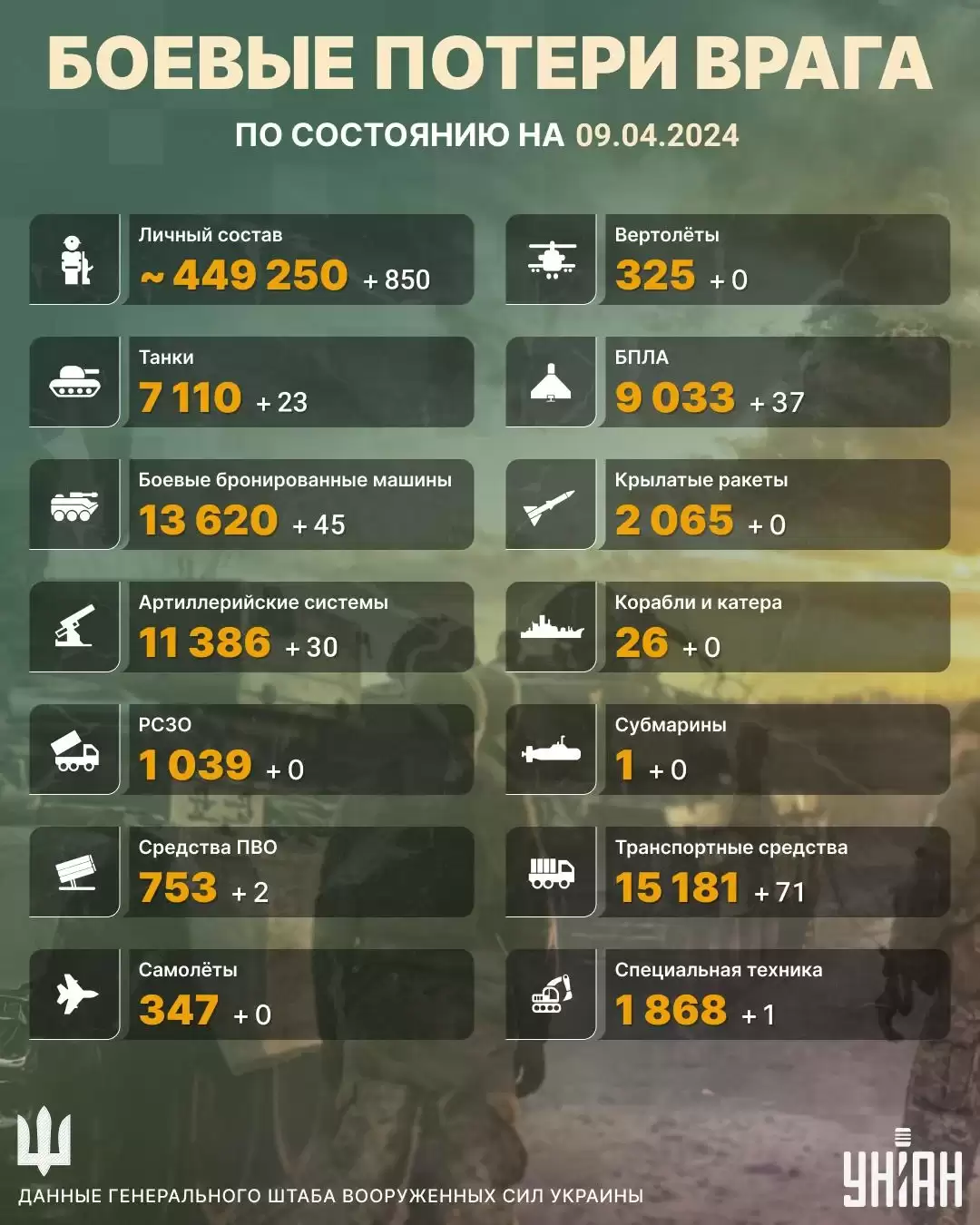 В Генеральном штабе Вооруженных сил Украины сообщили, что общие боевые потери противника по состоянию на 9 апреля ориентировочно составили: