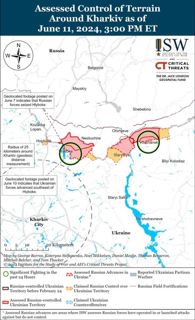 «Украинские силы недавно восстановили утраченные позиции в направлении Липцы (к северу от Харькова) на фоне длительных боев на севере Харьковской области 11 июня. Геолокационные данные, опубликованные 10 июня, показывают, что украинские силы восстановили позиции вдоль дороги О-212553 Липцы-Харьков к юго-востоку от Глубокого (к северо-востоку от Липцов)», — говорится в отчете.