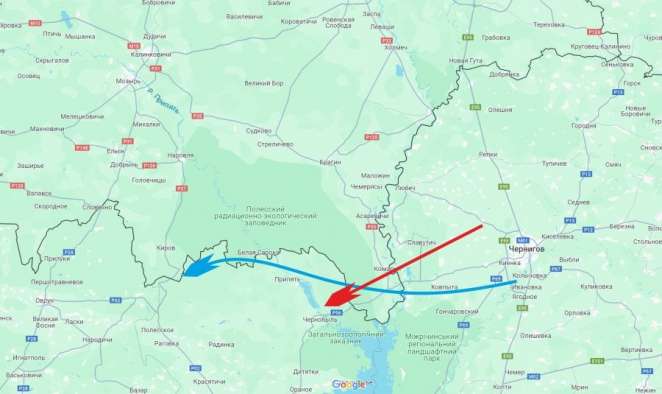 «Первая ракета зафиксирована в 3:40 [обозначена красным цветом]. Вторая группа шла позже [обозначена синим]. Где-то в районе чернобыльской зоны она исчезла, дальше появилась в Ровенской/Волынской области и на Луцк зашла».