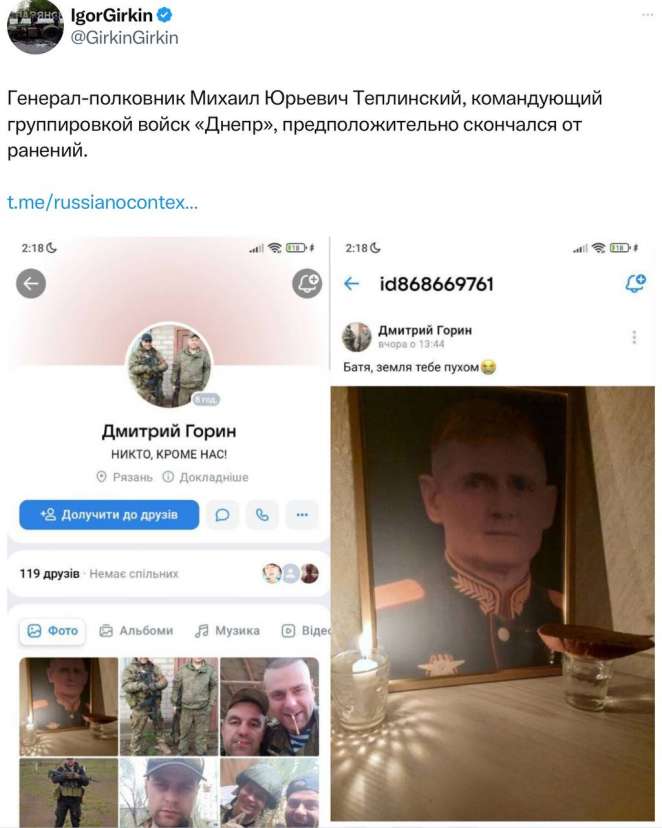 «Генерал-полковник Михаил Юрьевич Теплинский, командующий группировкой войск «Днепр» предварительно умер в результате ранений», — проинформировал он.