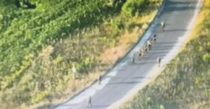 Российских военнопленных ведут под конвоем по дороге в Курской области - видеофакт