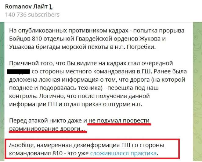 Военный корреспондент Романов заявил, что местное командование, вводя в заблуждение Генеральный штаб, сообщило о переходе под российский контроль дороги, где затем произошло массовое подрывание российской техники.