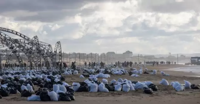 На кадрах можно увидеть огромное количество собранного в мешки мазута. Однако из-за нехватки техники эти мешки вовремя не вывозятся, в результате чего мазут под воздействием солнечных лучей начинает протекать и снова попадает в песок.