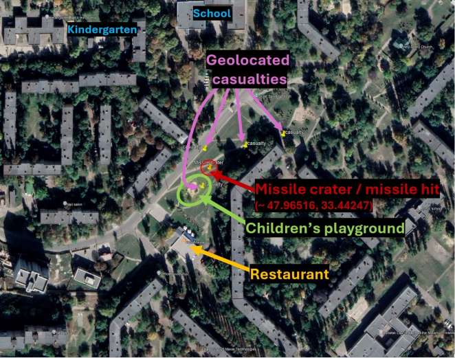Проект CIT также сообщает, что ракета упала всего в нескольких метрах от детской площадки, примерно в 70 метрах от ресторана, и отметили, что использование боевой ракеты с поражающими элементами подтверждается характером повреждений.